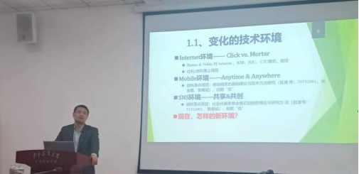 讲座伊始,鲁耀斌教授首先介绍了我国近十年间新技术环境的变化,从Internet环境,Mobile环境和SNS环境三个方面进行了详细分析,指出当前我们面临新的环境,AI技术和大数据快速崛起,网络环境经历了Internet—Mobile—loT的变化,人们的需求也从最初对有形产品的需求转变为对无形服务的需求。智能和互联两个要素在变化过程中起着关键作用。