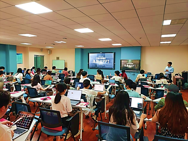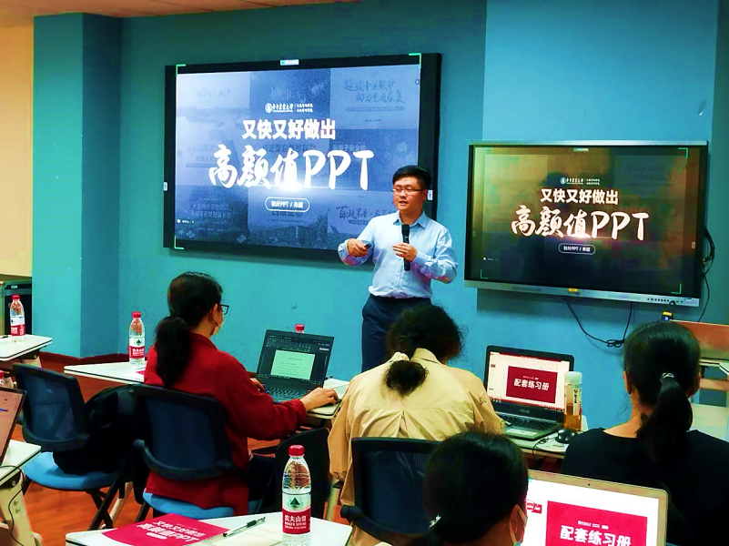 现场实操环节,老师带领大家对PPT案例拆解分析,细化步骤操作并现场协助解答,帮助师生们理解和制作出同样精美的PPT。