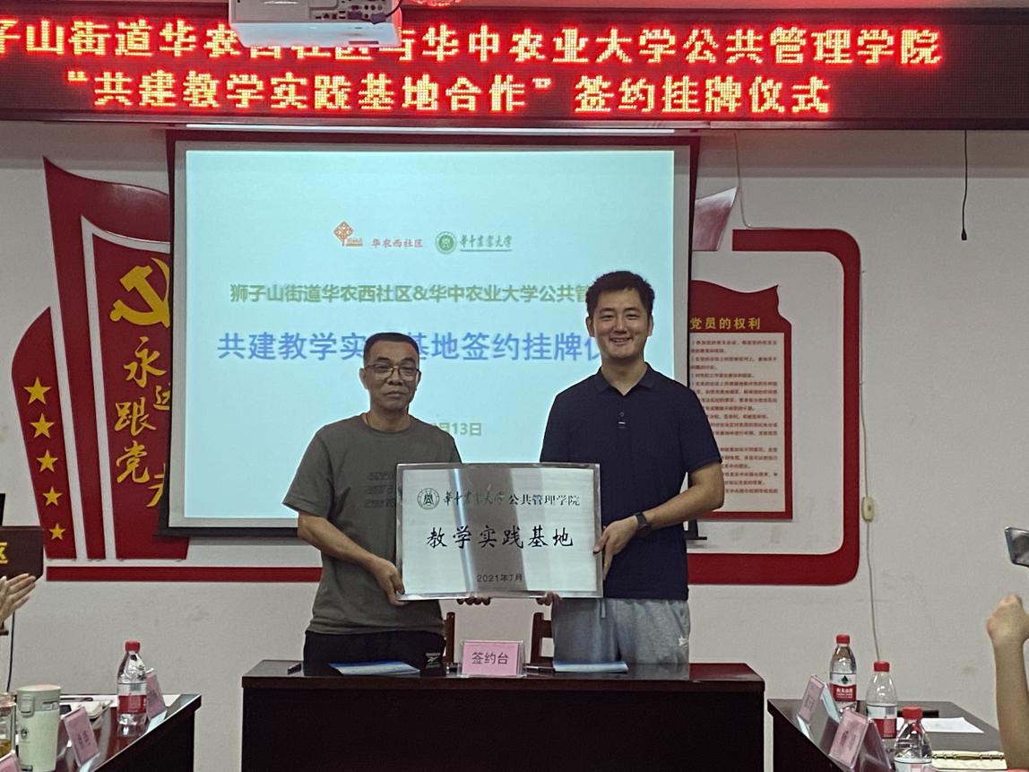 公司行政管理系主任姜庆志和华农西社区居委会主任肖万斌签订“共建教学实践基地”协议,并为西社区挂牌。