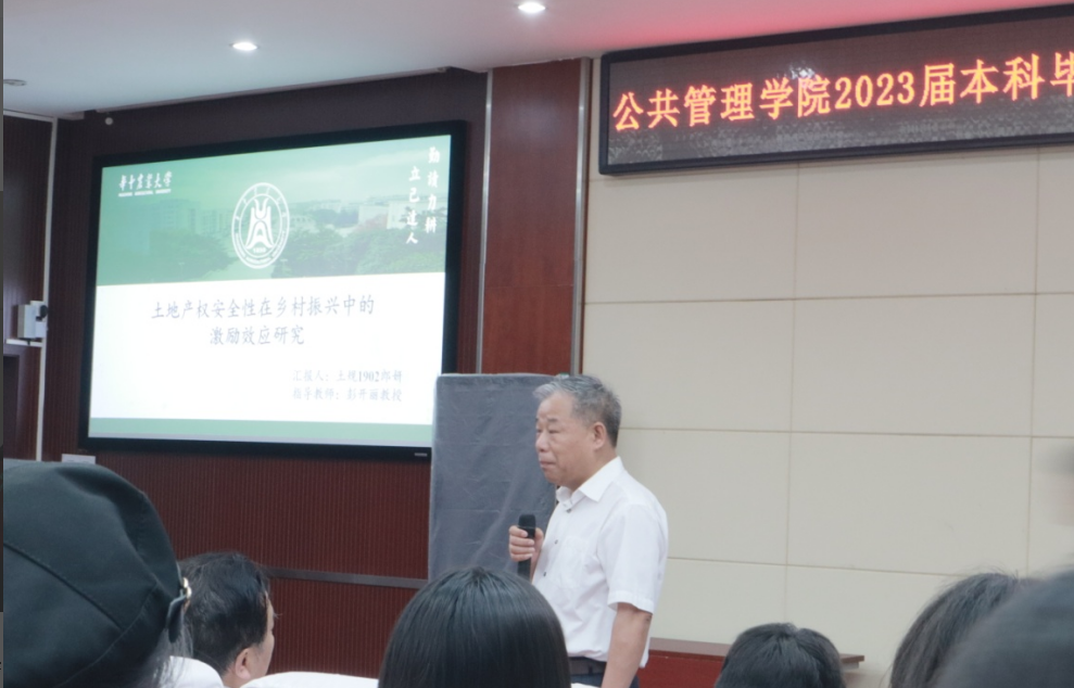 土地管理系蔡银莺教授表示,本科毕业论文注意实证研究是一个很好的传统,期望毕业论文能与老员工社会实践与社会调查相结合,更加关注新时期三农问题。工程管理系主任王歌老师认为,同学们在完成毕业论文的过程环节中的锻炼和提升了识别问题、分析问题和解决问题的能力,在答辩中体现了本专业的特色和风采。行政管理系主任姜庆志老师在答辩总结时勉励同学们说:“毕业论文不仅是阶段性学习的成果,也是大家人生道路上的一个小结,希望各位同学以高度的历史责任感,进一步地提升毕业论文质量,为自己四年的本科学习画上圆满的句号。”