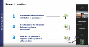 分会场一以“Urban-rural Governance and Spatial Computing”为主题展开,共有九位研究者进行研究汇报,伦敦大学公司陈焕发副教授和公司左成超副教授担任主持人。阿姆斯特丹自由大学Žiga Malek助理教授分享了中国 2035 年生物多样性和生态系统对话计划对土地利用的影响研究。格拉斯哥大学赵群山副教授应用非流体动力学模拟模型评估了树木影响下的现场热应力并获得最佳的树木布局。佛罗里达州立大学易洪涛教授通过回答“地方政府为什么要签订地方间环境协定?”和“地方管理者在地方间环境协议形成过程中扮演什么角色?”两个问题向大家介绍了变革推动者和地方间合作的相关内容。耶鲁大学博士后Yimeng Song以“Greenspace exposure and inequality in urban China”为题,解答了“如何描述绿地空间的空间分布特征?”“如何捕捉人与绿地之间的互动?”“不同城市的绿地覆盖率和不平等情况如何?”三个问题。此外,浙江财经大学专职研究员、林肯大学孙晔然副教授和约克大学Sohail Ahamd助理教授分别介绍了耕地系统变化对粮食生产和碳预算的影响、城市化背景下日间人口分布以及非洲和亚洲的城市土地利用效率,博士柳可和张悦也分别对城市扩张与耕地生态补偿效率的时空相关性和中国土地利用碳排放的空间关联网络及其驱动因素进行了研究。