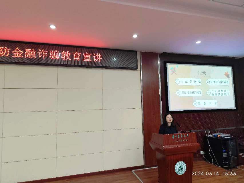 中信证券閤水清研究员以“学征信,懂征信,用征信”为主题,从征信的概念、征信活动的流程、相关部门的规章、征信修复骗局提示等方面进行了宣讲,并用征信类诈骗的短视频警示师生防范此类金融诈骗。