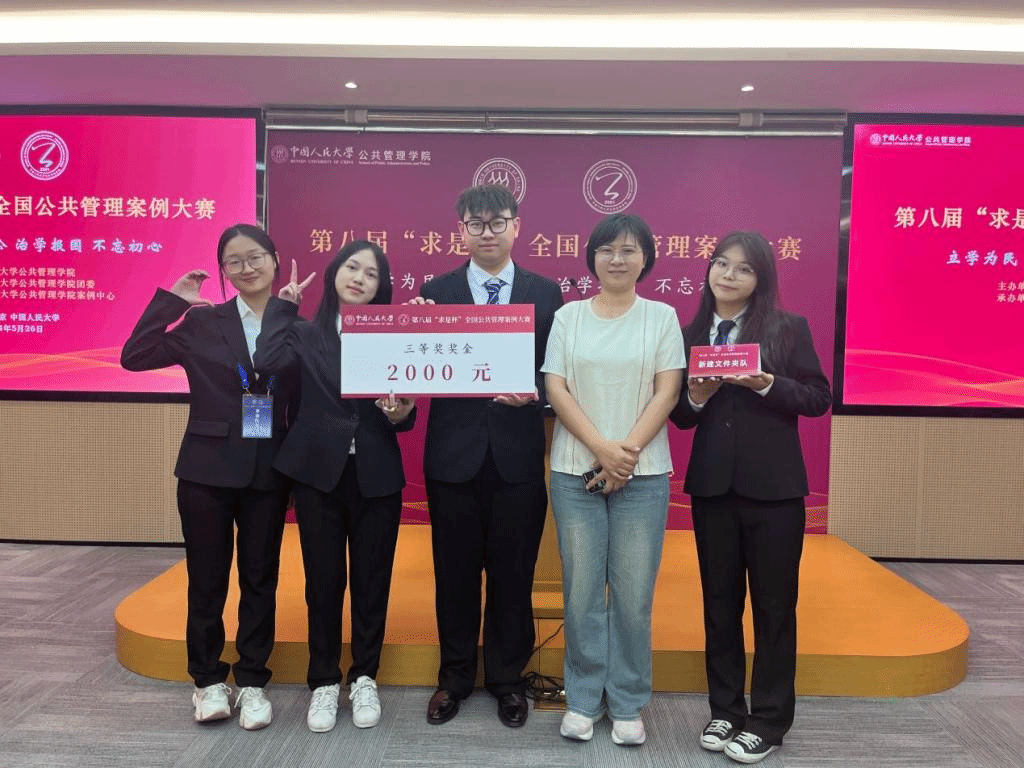 5月26日,第八届“求是杯”全国公共管理案例大赛于中国人民大学立德楼举行。本次大赛共吸引了来自全国高校的525支本科生队伍报名参赛。由公司行政管理系杨嬛、姜庆志老师指导,2021级行政管理专业本科生刘鸽、蔡嘉译、罗鸣晔、李婧怡组成的“新建文件夹”团队,撰写案例分析报告《“合”衷共济焕新颜,“作”贾行商乡村繁——中部传统乡村凤凰村的新型集体经济发展路径探索》,最终跻身全国八强,荣获全国三等奖。