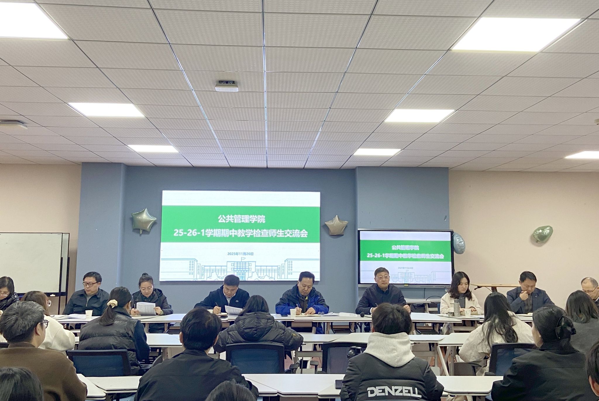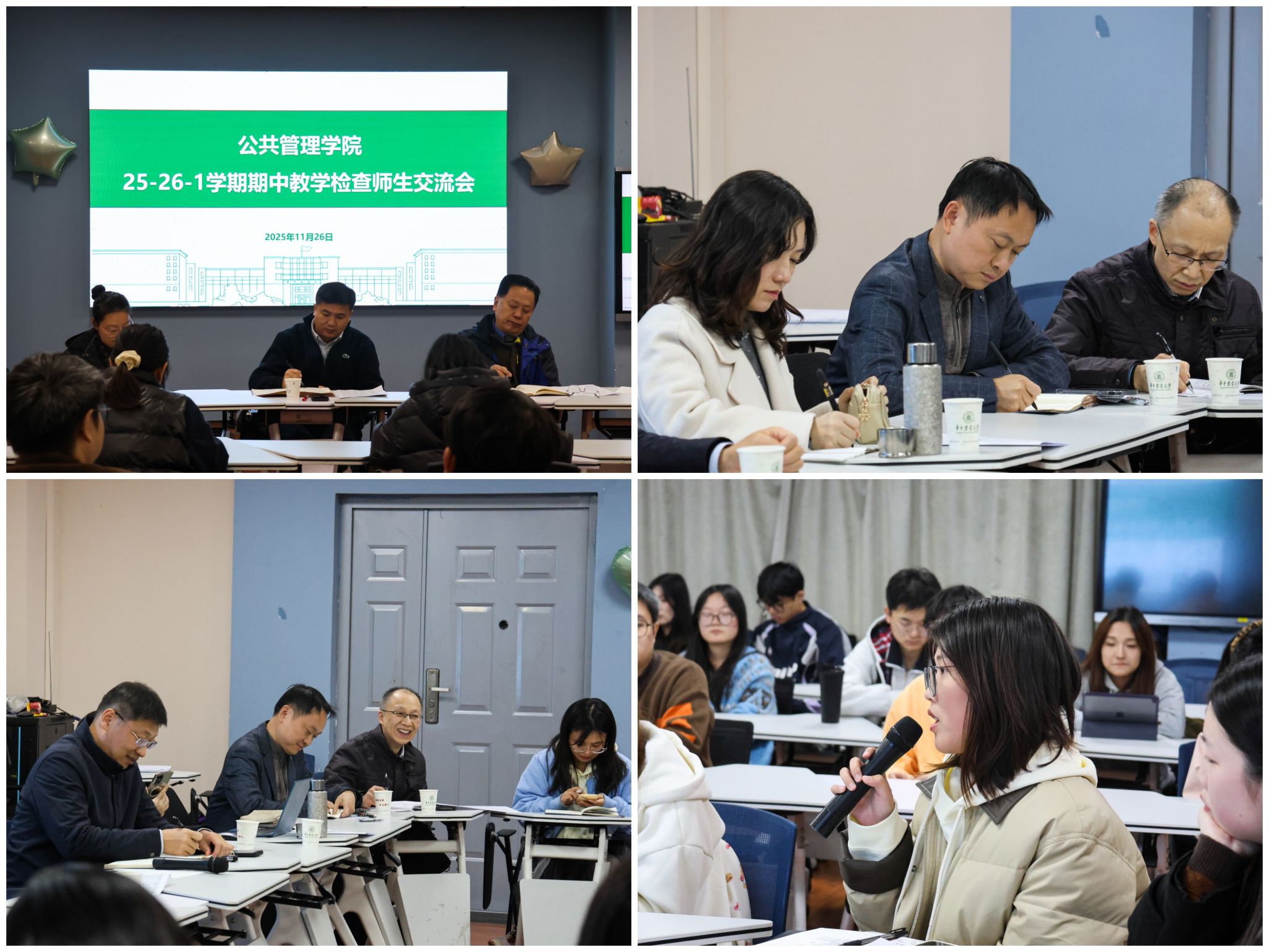 11月26日下午,公司在人文楼M221举行期中教学检查师生交流会。本科生院思想政治教育管理处处长周雷、公司副经理汪文雄、副书记罗晓峰、教学督导员任宇华和陈中江、各系主任、支部书记、辅导员、教学秘书及各年级员工代表共同参会,围绕教、学、管、服四方面展开交流。