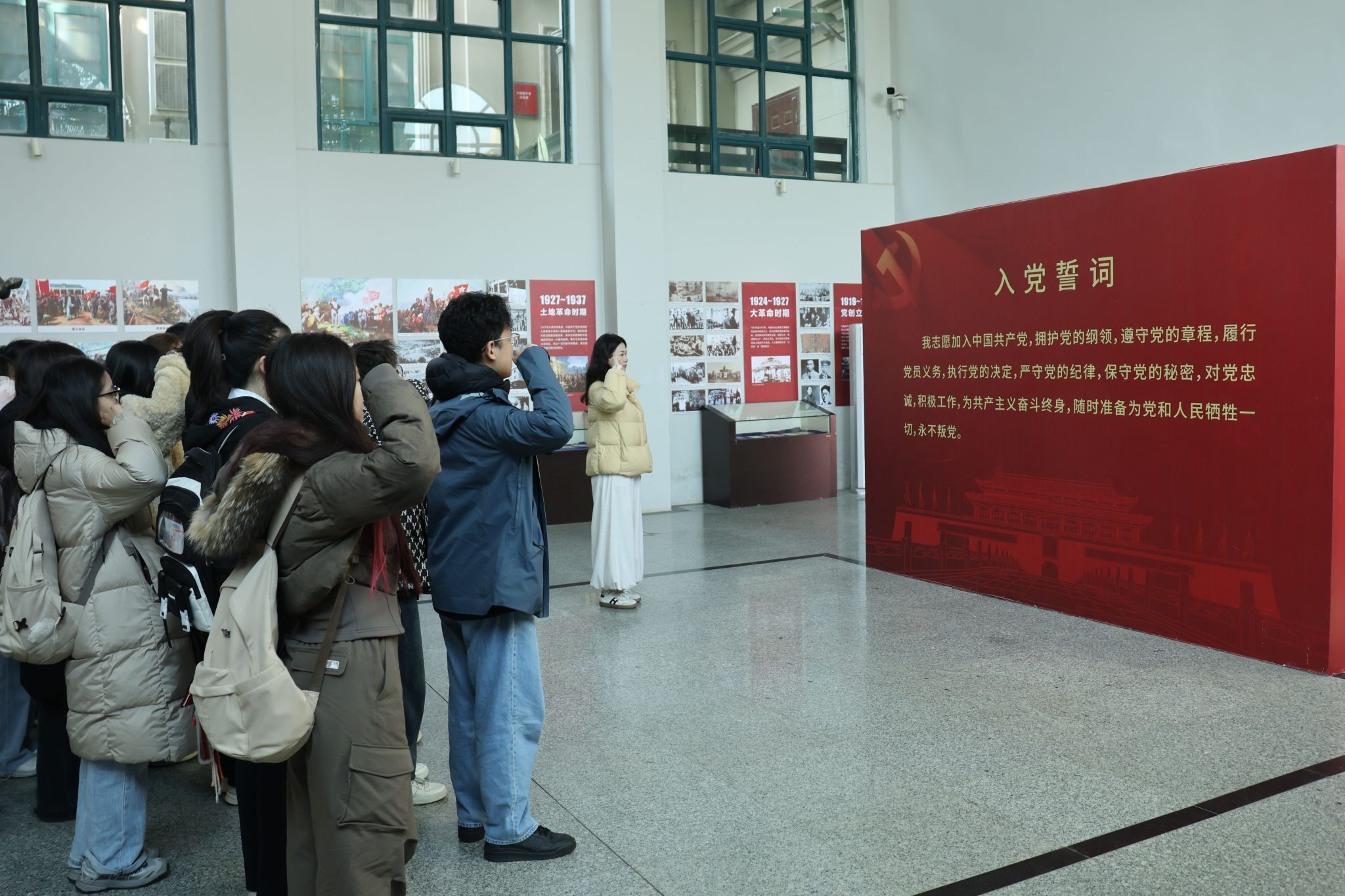 在庄严肃穆的抗战纪念馆内,公司党建辅导员倪含荞带领全体同志面向党旗庄严宣誓。铮铮誓言,字字千钧,表达了他们为党的事业不懈奋斗的坚定决心。将宣誓环节融入红色实地场景,是公司强化预备党员党性教育的常态举措,旨在强化党员的身份意识、责任意识和使命意识,引导新发展党员扣好“第一粒扣子”。