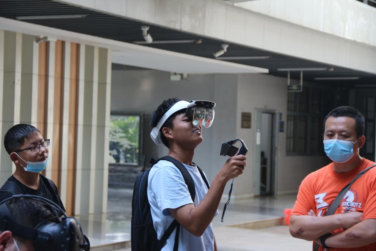 之后,王红老师细心教授同学如何正确佩戴和操作VR眼镜,时不时地鼓励同学大胆地走两步,体验VR虚拟世界,并在一边提醒大家要注意脚下安全。新生们积极参与实景三维体验活动,身临其境地体验VR工程中的虚拟场景,切身感受三维测量的魅力。