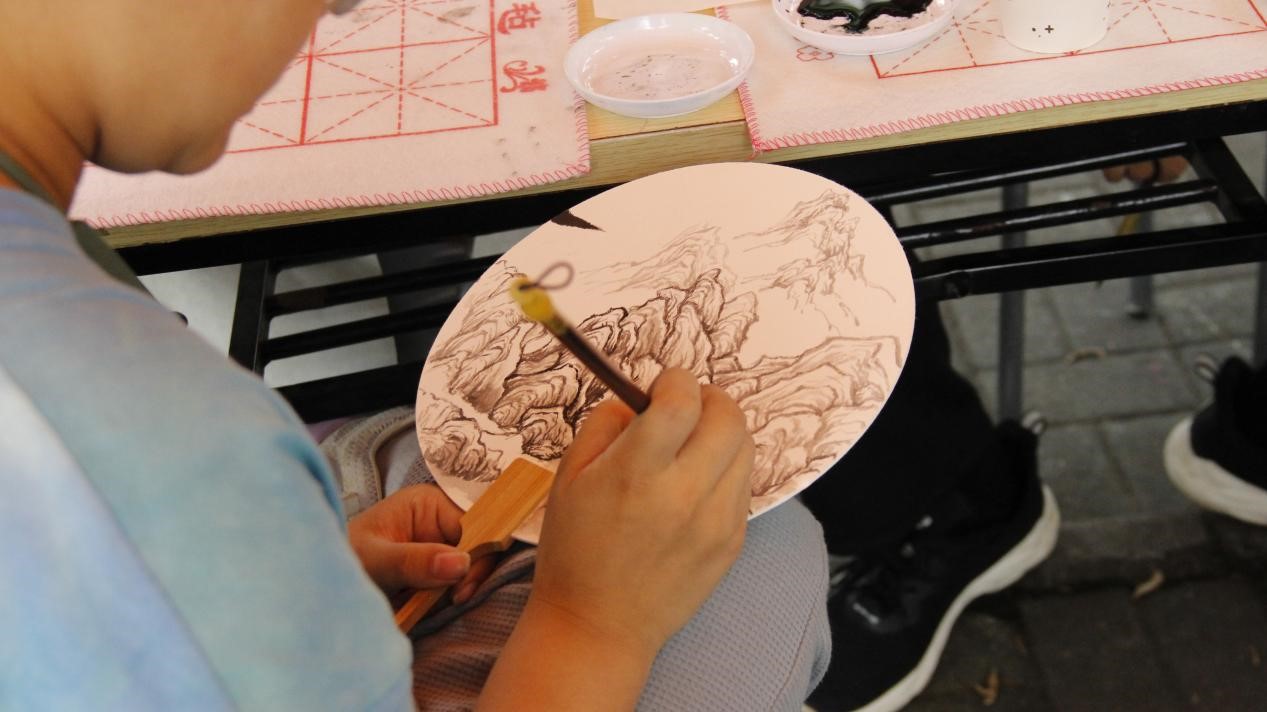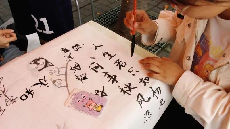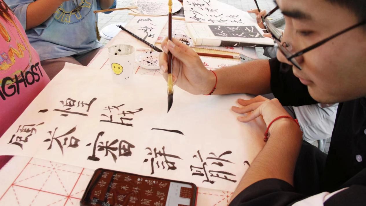 “人生若只如初见,何事秋风悲画扇……”一笔一划,写的是所思所想,一撇一捺,书的是所情所感。现场还有被书法艺术吸引而来的小朋友,稚嫩但认真的字迹里,蕴含着她对生活、对家人、对自己的愿景与希冀。在尝试完书写毛笔字后,同学们开始体验用毛笔来绘画,在精工细描中,山川、河流、花草树木等自然景物跃然纸上,呈现出一副大自然相映成趣的画面。