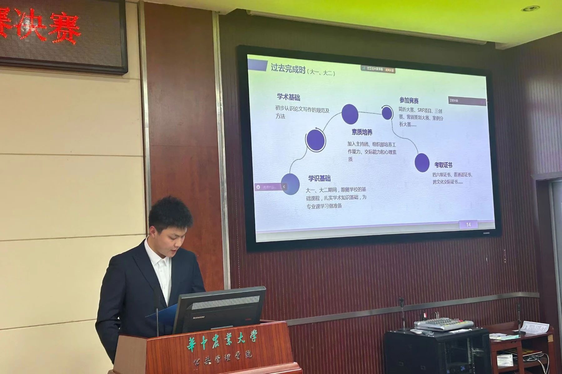 在本次职业规划大赛中,选手们登台深入剖析自身的优势与劣势,结合个人兴趣与爱好,融入家国情怀与责任担当,明确自己的行动方向,分享自己的职业规划历程。其中有不少同学给评委们留下深刻的印象,有理想成为聆听古物的声音,做数智时代下的文化声音留存师;有致力于乡村振兴,帮助赣南脐橙走出国门的农业经理人;还有立志成为“公”坚在乡村,“益”心为留守的全职公益人。