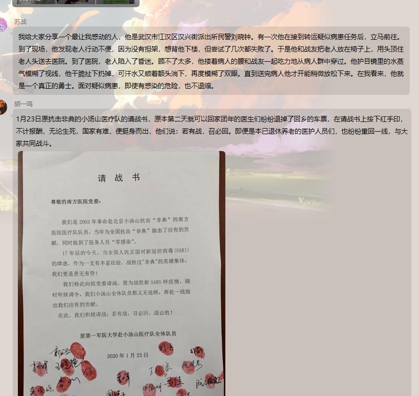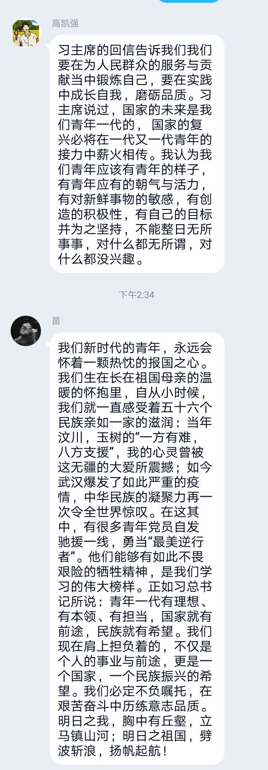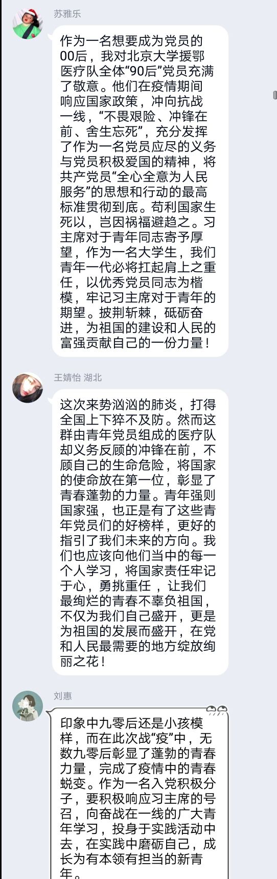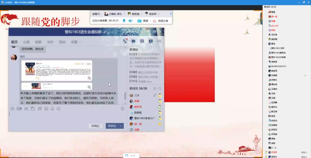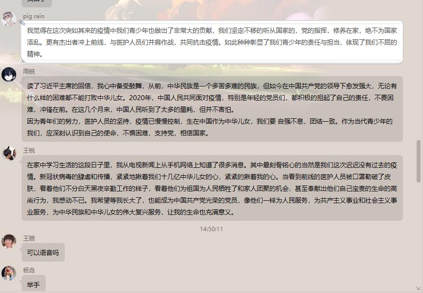 紧接着,同学观看了抗疫期间的短纪录片,分享自己在抗疫期间了解到的感人故事。对这场即将进入尾声的疫情,同学们内心深有感触,纷纷通过线上语音等形式讲述了最触动自己的故事。其中,薛世浩同学讲到了自己的家乡——内蒙古的小伙伴,在疫情期间作为志愿者为同胞服务的感人故事。正是因为青年们的努力和医护人员的坚持,疫情已慢慢控制。在最后的讨论环节,各位同学积极参与,发表自己的感想,气氛热烈。王锐同学表示:“我们作为中华儿女和当代青年老员工,应当团结一致、自强不息,深刻认识到自己的使命,听党话跟党走,不惧困难。”