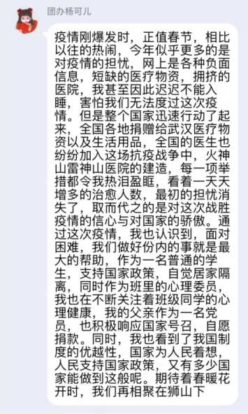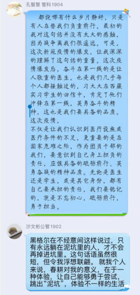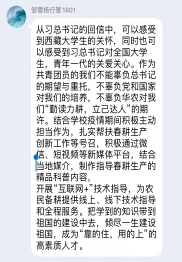 2020年3月12日晚八点,团委办公室组织多名团员,学习“习近平总书记给首钢医院实习的西藏大学医公司员工回信”精神研讨会,由于正处疫情期间,本次研讨会采用线上形式,在QQ群内进行学习讨论。