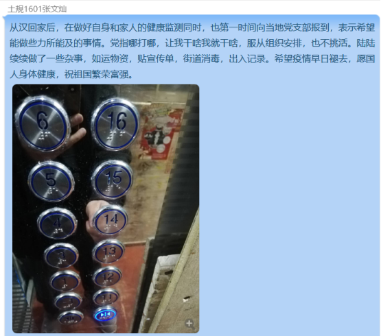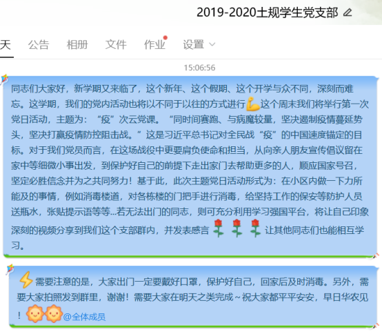 土地资源管理本科生党支部的成员们分布在全国各地,心都紧密地联系在一起。本次主题为“疫”次云党课的主题党日活动,我们通过网络,分享自己在所在社区中做的一些力所能及的事情。每一位同志用实际行动,践行习近平总书记提出的时间赛跑、病魔较量,坚决遏制疫情蔓延势头,坚决打赢疫情防控阻击战还有一些隔离在家的同志们充分利用学习强国APP,上传了让自己印象深刻的视频,表达了对一线战“”人员的敬佩和感激。