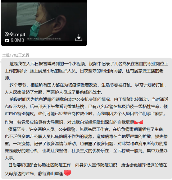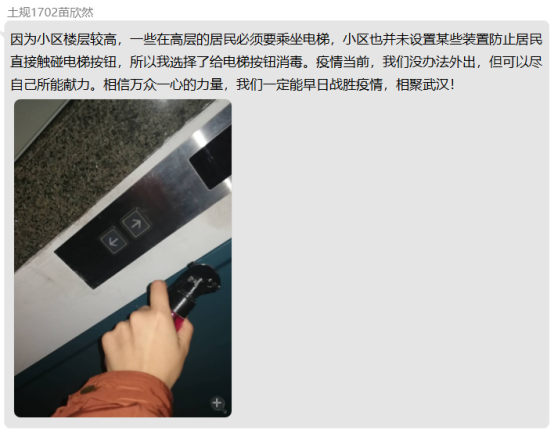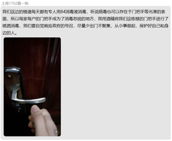 栗塞雅同志在社区值班,登记出入人员信息,测量体温;王姝文同志向大家分享“凡人小林”的故事;大家都自发在社区各处进行消毒。王艺霏表示:“疫情至今,许多医护人员、公安民警,包括基层工作者,在抗争病毒期间牺牲了生命,也不乏很多地方公职人员包庇隐瞒不作为的现象,造成病毒在当地更严重的扩散,损失惨重。一场疫情,记录了很多温情与感动,也暴露了很多问题,对此党和政府果断有力的措施是最好的定心丸,也更让我坚信,社会主义的优势所在,全民拧成一股绳,集中力量办大事。”