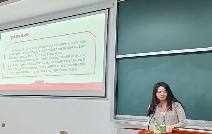 研究生第三党支部蒙仁媛围绕《总体国家安全观学习纲要》,深入浅出地解读了总体国家安全观的核心要义与深刻意义。她详细介绍了武汉国家安全教育网络基地平台,让在场党员们对国家安全有了更为深刻的认识。蒙仁媛强调,武汉这座充满光荣革命传统的红色城市,在中国共产党历史和中国革命进程中闪耀着璀璨的光芒。接着,蒙仁媛又带领大家深入学习了习近平总书记的重要文章《必须坚持人民至上》。她强调,站稳人民立场、把握人民愿望、尊重人民创造、集中人民智慧,是指导我们认识世界和改造世界的强大思想武器。这一理念深深触动了在场的每一位党员和积极分子,更加坚定了为人民服务的信念。