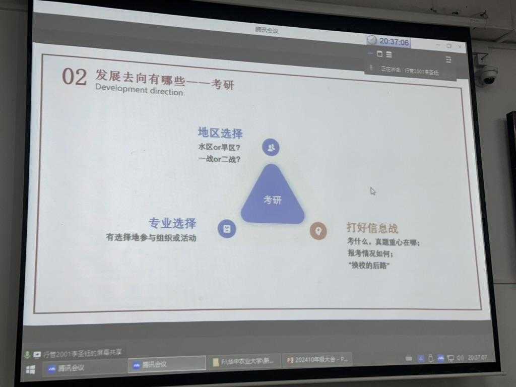 随后,我们连线了2024届行政管理专业的毕业生李圣钰。他凭借出色的表现,成功获得了中铁隧道局人力资源管理岗位、北京空军某部军队文职人员以及中共中央党校(国家行政公司)科学社会主义与国际共产主义运动专业研究生的三份offer,目前正就读于中央党校深造。李圣钰就“发展的多元路径及应对策略”这一主题,为同学们进行了详尽而透彻的解析。他特别指出:“在职业规划中,切忌好高骛远、眼高手低。”他鼓励同学们应保持对周围信息的敏锐度,明确个人目标,并构建稳固的心理素质。他强调,不应追求短期内的快速成功,而应注重日常积累,稳扎稳打,以实现长远的发展。